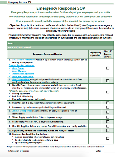- Contact information for emergency services and contacts (including the owner, vet, milk handler, equipment dealers, and power company), and the site address must be posted in a prominently in languages understood by the employees